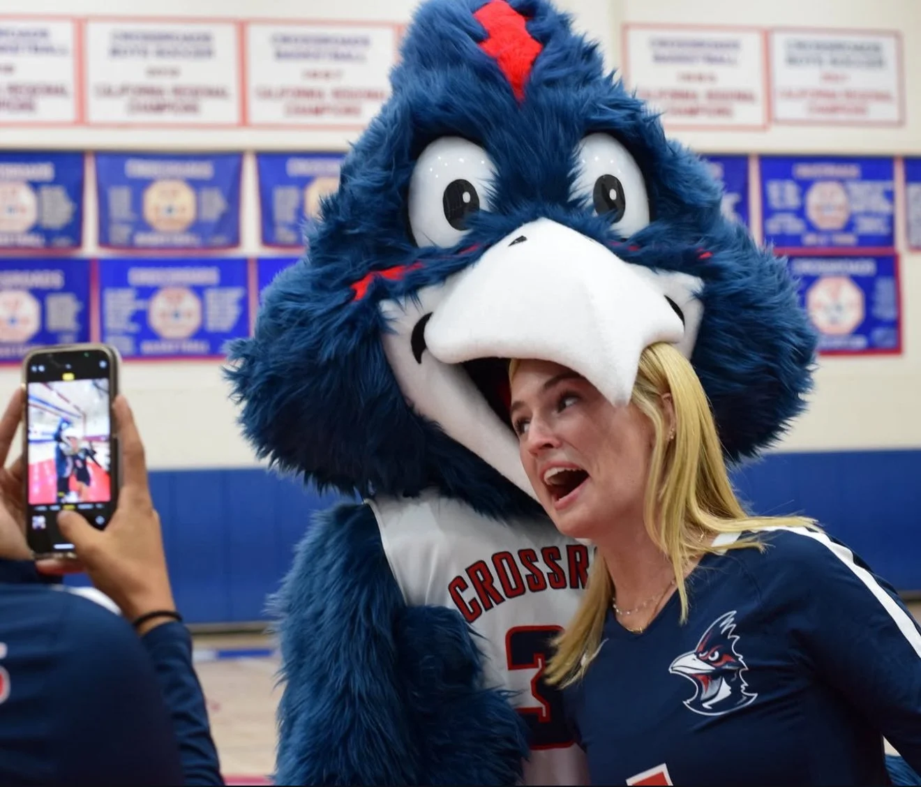A woman interacts with a person dressed in a large blue mascot costume of a bird, likely a sports team mascot, in an indoor gymnasium setting. The woman is smiling and leaning toward the mascot, while someone in the foreground is taking a photo of th